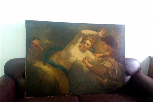 土耳其缉私部官员公示了缴获的作品照片,画中一位袒露上身的女子手臂上扬,另外还有两人出现在画中。但当局并未透露画作的确切作者。