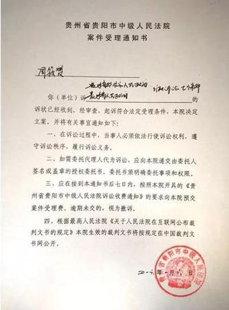 2015年10月8日,周筱赟向贵州省政府提起行政复议,要求贵州省政府责令毕节市政府公开7份申请公开的信息,但在12月7日被驳回,省政府对毕节市政府的7项 具体行政行为作出维持的决定。随后,周筱赟针对毕节市政府、贵州省政府的7项具体行政行为,一并向二者提起7个行政诉讼案件,起诉至贵阳市中院。今年1月 8日,他收到了贵阳市中院1月6日做出的《案件受理通知书》。