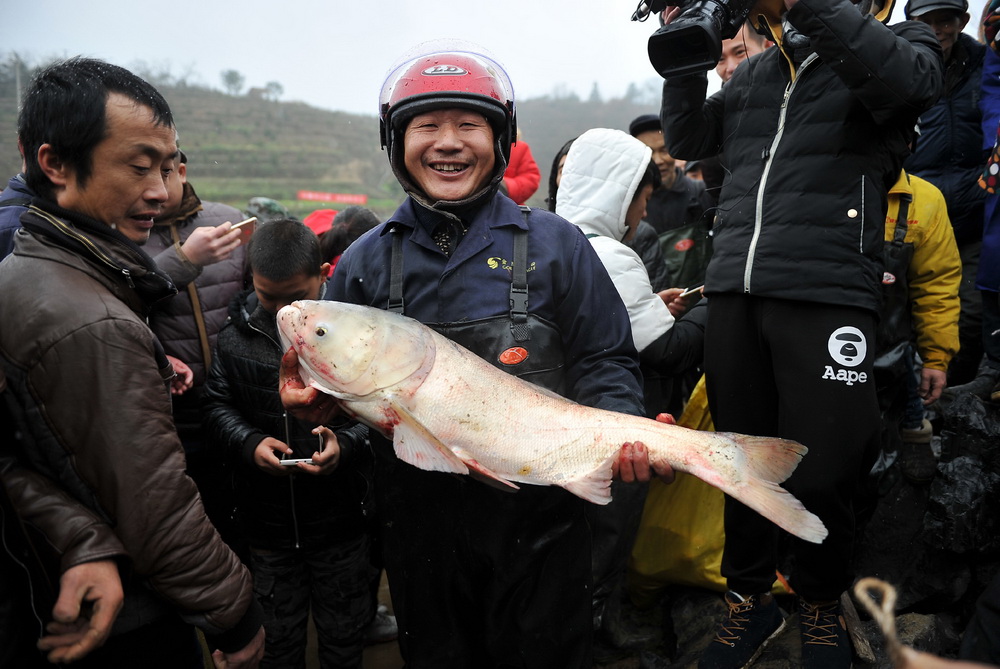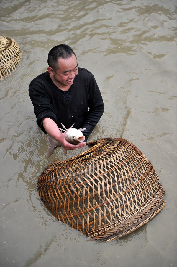 1月13日,张家界市砂子垭村举行“鸡笼罩鱼”比赛,人们拿着竹篾编织成的鸡笼,下到膝盖深的水塘里进行捕鱼?!凹α钟恪笔堑钡胤昴旯诘囊幌畲诚八祝耐凶湃嗣瞧砼文昴暧杏?,五谷丰登的愿望。新华社发(邵颖 摄)