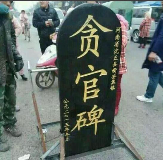 河南省周口市沈丘县新安集镇新东行政村村民李某,在当地立了块“贪官碑”。随后,又把此碑装上手推车拉到镇大街上,石碑当天被砸毁。官方表示,李某立碑是因对土地补偿款不满意,是为达到个人目的、别有用心。据报道,除了土地赔偿款纠纷,李某近年来还不断向上级部门反映该村干部李×等人破坏耕地、偷税漏税等一系列问题。(《法制晚报》1月13日)
