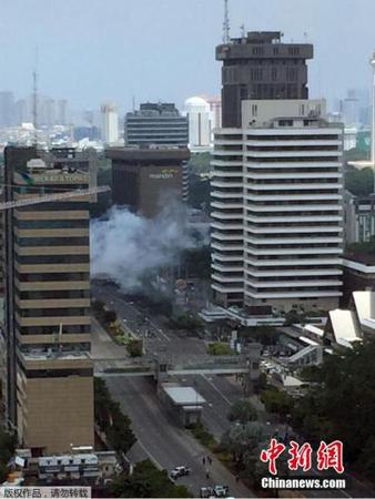 爆炸现场冒出浓烟。1月14日,雅加达遭到多起爆炸袭击,导致7人死亡,印尼总统佐科谴责袭击是“恐怖主义行径”。