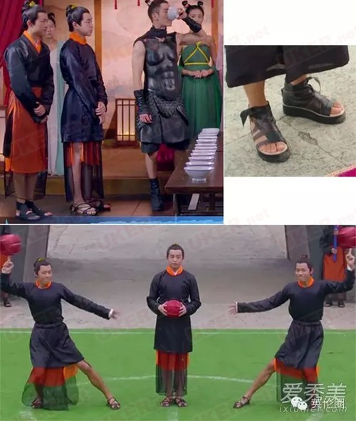 虽说是“穿越”到了古代,但剧中人物的衣着并没有严格按照历史中真实的风格来设计,而是反其道而行之。比如,宫里的快递员穿着京剧戏服(宫里还有快递员……);主演们屡屡露出大腿,被观众总结为剧中人物似乎都不太喜欢穿裤子;演员们穿凉鞋上阵;男一号有一身肌肉盔甲,还身背木头桩子等等。