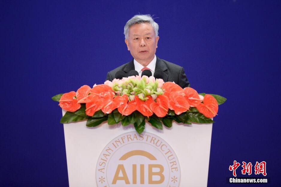 1月16日,亚洲基础设施投资银行开业仪式在北京钓鱼台国宾馆举行,金立群致辞。当天上午刚刚结束的亚投行理事会成立大会上,中国财政部部长楼继伟被选举为首届理事会主席,金立群当选亚投行首任行长。中新社记者 廖攀 摄