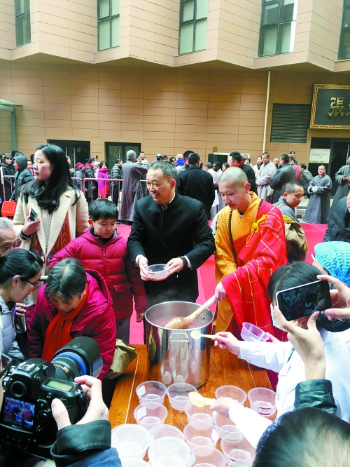 昨日上午8时30分,少林寺在郑州古玩城花园茶城设立的大型免费施粥与祈福法会现场,大河报记者看到有不少市民排队等待,其中不少都是在附近工作的环卫工人、物业员工和农民工。腊八粥为现场熬制,9时30分,在祈福仪式和功夫表演结束后,施粥正式开始,少林寺僧人为大家奉上了热乎乎的少林腊八粥。在寒冷的天气里,一口热粥下肚,顿感浑身温暖。在花园茶城做古玩生意的张女士说:“早就听说过少林腊八粥,但从没机会喝过,没想到今年在家门口一早就喝上了,太开心了!”