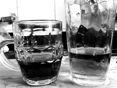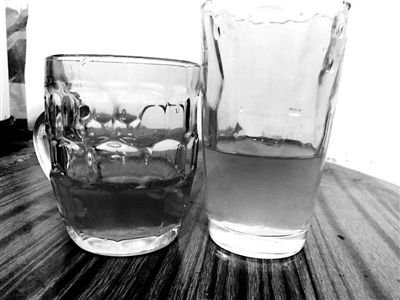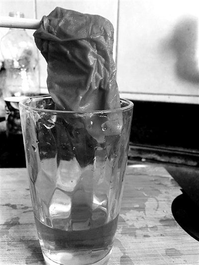 随后,北青报记者将深紫色的“芬达”葡萄味汽水倒入杯中,同样往里头放入一张纸巾。搅拌了几下后,发现饮料颜色很快变淡,两分钟后,原本深紫色的汽水变成了淡紫色。
