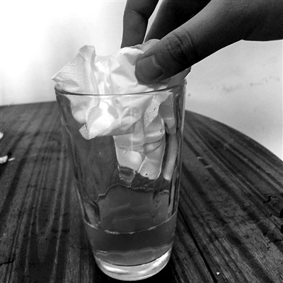 用纸巾搅拌带有颜色的饮料,真会出现视频里的效果吗?为了验证视频的真伪,昨日,北青报记者在市面上随机购买了“美年达”橙味汽水、“芬达”葡萄味汽水以及“醒目”西瓜味汽水三瓶饮料,进行实验。