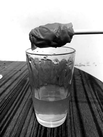 实验完紫色汽水后,北青报记者拿出水红色的“醒目”西瓜味汽水做实验。同样在倒出的汽水中放入纸巾,然后快速搅拌,两分钟后,原本水红色的饮料变成了粉红色,而纸巾却变成了水红色。