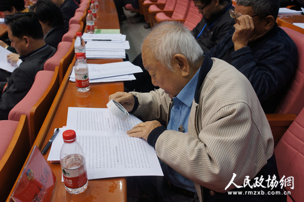 会上,88岁高龄的厦门市政协邀研究员、厦门文史专家洪卜仁用高倍放大镜,在逐字逐句认真看着市政协常委会工作报告。
