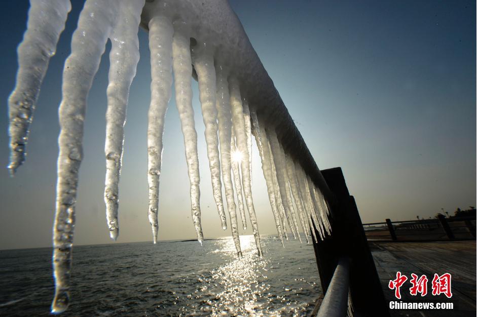 2016年1月18日,山东省日照市,海边出现冰凌景观。当日是农历“四九”第一天,山东省气象局发布天气预报:山东半岛地区北风5~6级阵风7级,夜间最低气温半岛内陆地区-10~-12℃。受冷空气的影响,日照市沿海浅滩出现零星冰碴和冰凌,均以初生冰和冰皮为主,未对海洋养殖和渔船作业带来影响。 图片来源:视觉中国