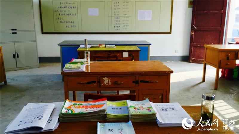 老师的办公室里摆放着教案、课本和作业,前面的白板上贴着课表。据介绍,所有的教学点课表都与镇中心小学同步,老师之间也定期交。