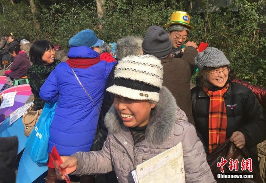 1月中旬,刚刚抢到红包的家长露出开心的笑容。上海人民公园相亲角如今已经成为上海新地标,不少家长放弃周末休息来此为儿女“撑伞寻偶”。1月16日,一商家来到相亲角,为在此苦苦守候的家长发放现金和产品积分红包,于是引得大妈、大爷哄抢。 中新社发 余清 摄