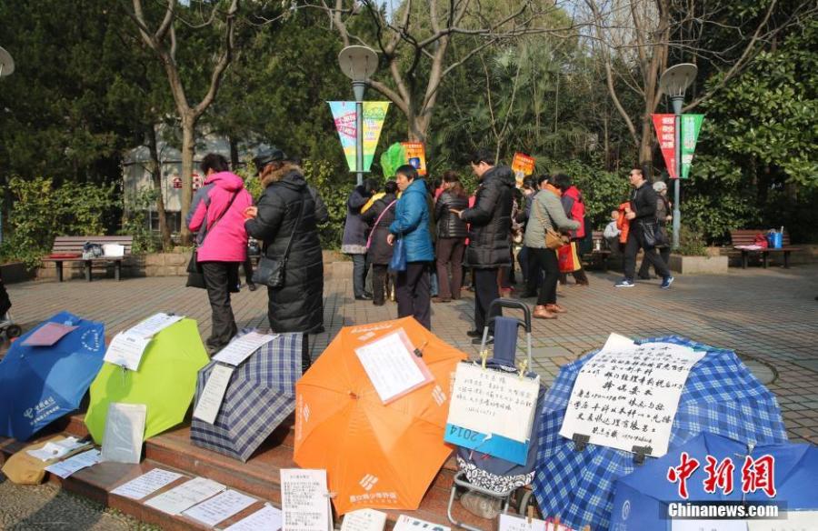 1月中旬,不少家长放弃周末休息来到上海人民公园相亲角为儿女“撑伞寻偶”。 中新社发 余清 摄