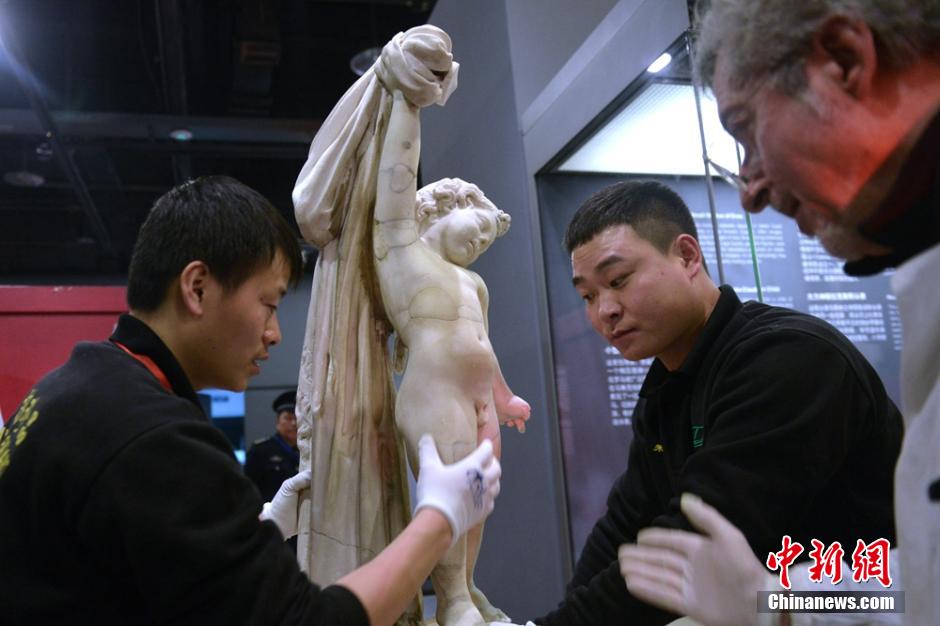 点交地点设在主题展厅,为了保证文物安全,这里采用非紫外线照明光源,分区准备了三个布展台,还在特制的实木桌上加装减震材料,铺上绒布。点交时,双方工作人员需同时在场,由专业运输人员开箱,触摸文物的人还要戴上口罩和手套。工作人员拆掉文物包装箱外的木板,对每个局部仔细检查,360度拍照近10张,并逐一核对点交单。任何一丝破损、划痕、修复痕迹都要记录在案,交由双方签字确认。这些珍贵的古罗马文物,许多还是首次在中国展出,其中最重的一件约1500公斤,最高的一件近2米。细致点交后,工作人员将所有展品按照既定设计图放到指定位置。