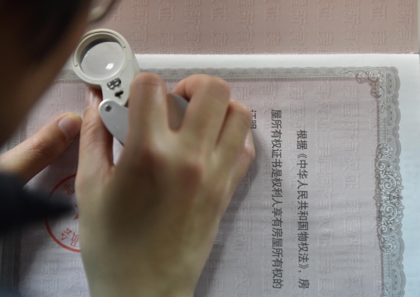 北京住房公积金管理中心的工作人员在查验一本房屋所有权证的真伪(1月20日摄)。新华社记者 罗晓光摄