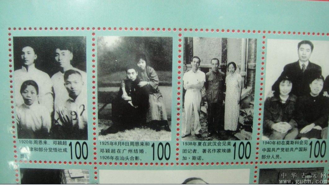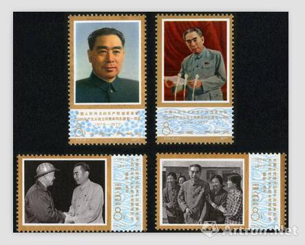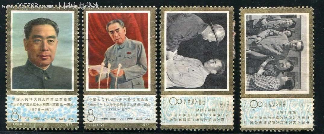 首枚“周恩来像”是备感亲切的周恩来标准像,下边点缀着翠绿的青松;第2枚“光辉的榜样”的画面是周恩来在1975年1月13日抱病在四届“人大”上作报告的情景,这是周恩来生前最后一次出席人民代表大会,这个报告重申在20世纪末实现四个现代化的目标;第3枚“敬爱的周总理和大庆人在一起”展现的是1966年10月周总理在北京接见石油战线先进单位代表时,与铁人王进喜亲切握手交谈的历史画面;第4枚是周总理视察大寨时,与郭凤莲等“铁姑娘”在一起的合影。这套纪念邮票曾被评为新中国建立30年最佳邮票,深受人们喜爱。