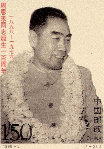 1998年3月5日,我国发行的《周恩来同志诞生一百周年》纪念邮票,全套4枚,各枚都有他的画像,面值共400分。这套邮票由范阳、时卫平设计,邮票图名分别为“军事家”、“开国总理”、“外交家” 和“人民公仆”,图案选自周恩来同志在各个不同时期的珍贵影像。