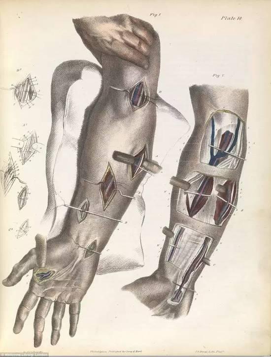 8、 这张1866年的图展示了外科医生如何捆绑小臂和肘部动脉来阻止血液流动。