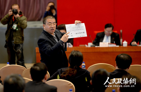 23日下午,北京市政协全会举行两场专题座谈会。图为委员发言时引用数据。田福良 包松娅 摄