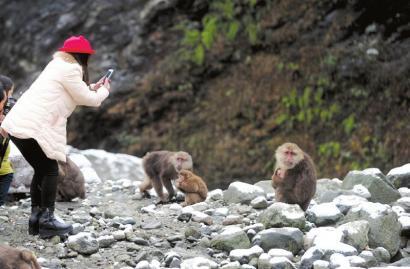 彭州龙门山百余猴哥下山觅食