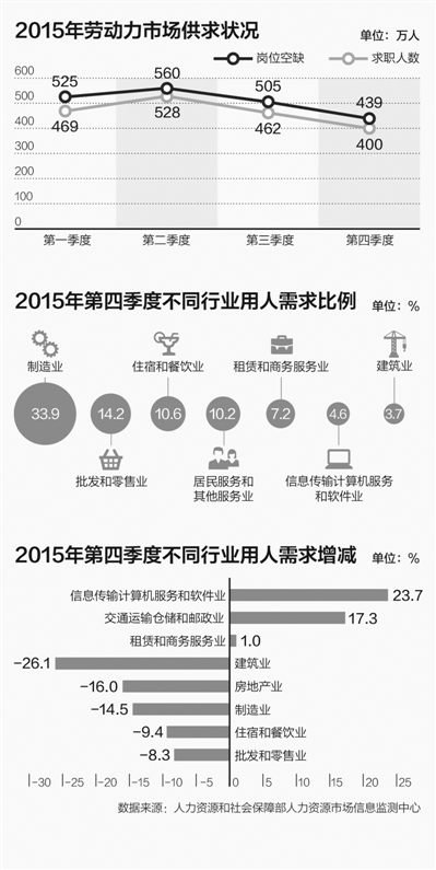 2015年第四季度的汇总数据表明,岗位空缺与求职人数的比率(求人倍率)约为1.10,用人单位通过公共就业服务机构招聘各类人员约439万人,进入市场的求职者约400万人。