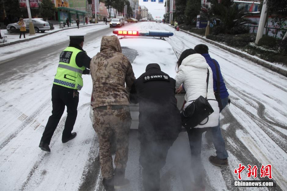 贵州警车送产妇遇凌冻天气 警民齐力推车