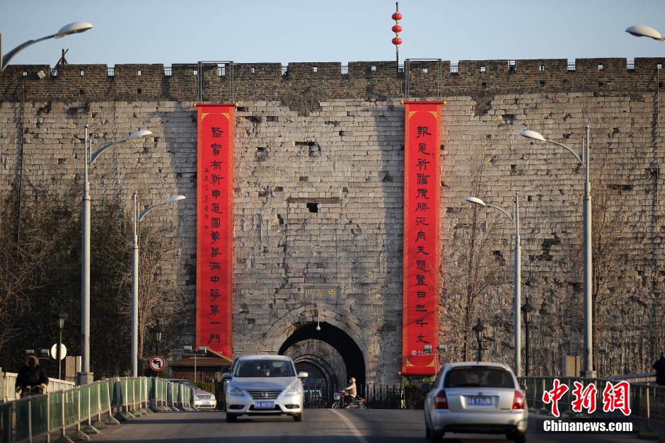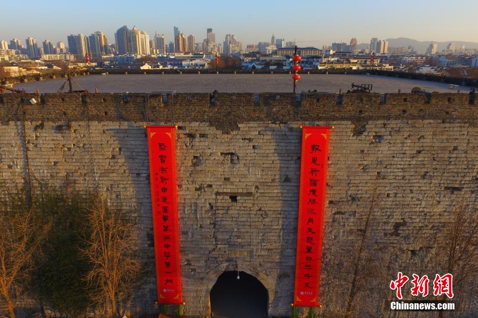 1月25日,一副长达15米的大红春联挂上南京中华门南门,上书“报恩祈福揽胜泛舟天悬丽日三千丈,聚宝布新申遗圆梦春满中华第一门”。据悉,这是650岁的南京明城墙首次挂出春联。中新社记者 泱波 摄