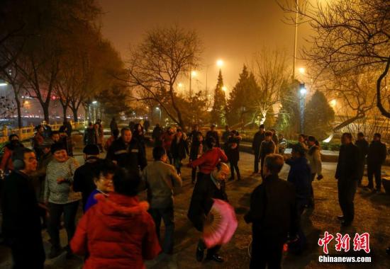 资料图:12月9日,北京空气重污染的夜晚,二环边的公园内广场舞并未受影响。 中新社记者 张浩 摄