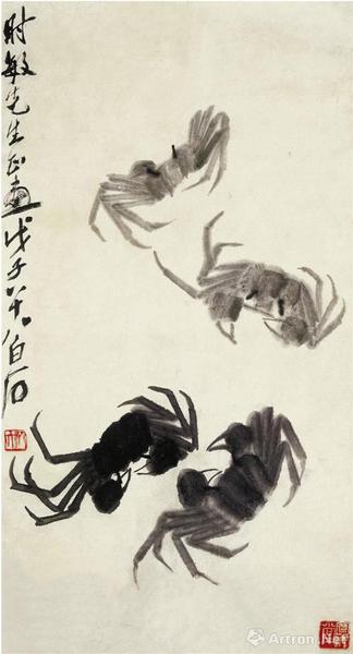 目前,国内拍场上齐白石画作的价格,基本有如下几个梯次:像老舍藏的开门精品价格在300万元一平尺;著录进《齐白石全集》的大致150—200万元一平尺;没进入《齐白石全集》的一平尺50-100万元之间,但不一定是真迹;临摹得有几分模样的高、中仿品,价格在40万元一平尺左右;仿得较差的低仿每幅都在百万元以下、几十万元附近。就笔者所观,近一两年国内拍场上几百万元成交的齐白石不少都是假的,真迹在六七百万元以上才有可能买到,但有时超千万的也不一定就是真品。尽管齐白石一生创作高产,但眼下能买到齐白石真迹也相当不易。特别是目前拍场上齐白石假画出现了几个新动向。首先,齐白石山水画明显增多,2015年秋拍上有多件齐白石山水画赝品上拍,如《滕王阁》、早期临八大山人风格的等等应有尽有。其次,人物画也呈增多之势,《铁拐李》、《老当益壮》等赝品纷纷涌现。第三,寿桃、鸡冠花等吉祥类题材赝品蜂拥而至。第四,水族类鱼、虾、蟹、蛙假画依旧很多。如2015年国内秋拍上出现的一件《四蟹图》(图2)就明显是一件克隆伪作。真?!缎贰?图1)的款书:“时敏先生正画,戊子八十八白石”,铁划银钩,阳刚有力,反观克隆伪作《四蟹图》,款书完全雷同,一字不差,但用笔软弱无力、有如墨猪,更谈不到笔势和连贯,一眼就是明显的赝品。