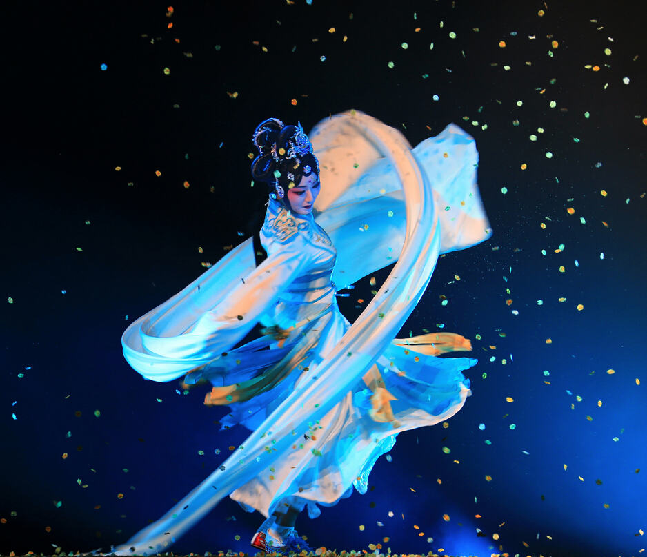 原本《嫦娥奔月》中的水袖舞用的是普通水袖,而肖迪在复排版中使用了2.5米长的水袖,起舞同时,舞台上方“桂花雨”纷纷落下,极具“寂寞嫦娥舒广袖”的优美意境和震撼的视觉效果。与水袖舞配合的民乐打击乐以鼓为主,以京胡为辅,动感中不乏柔美?!拔颐蔷纳杓屏怂湮璧呐淅?,力求让大家听到这段音乐就能想到《嫦娥奔月》?!毙さ纤?。