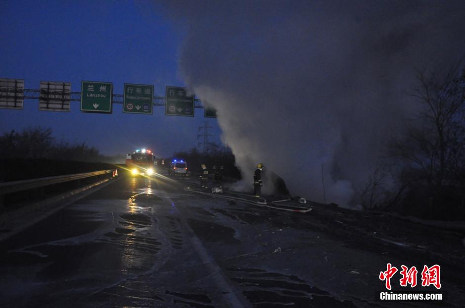 1月25日早上6点,兰州市境内的巉柳高速公路上两辆大货车相撞并引发火灾。兰州消防支队随即出动了75名消防官兵赶赴现场处置火情,所幸事故未造成人员伤亡。由于现场火势较大,侧翻在路基下的货车起火并引燃周围树木、农民的大棚,消防官兵顶着寒风,经过近11小时的紧张扑救,大火被完全扑灭。同时,多位消防官兵的衣服在救援过程中结冰变硬。甄连长 摄