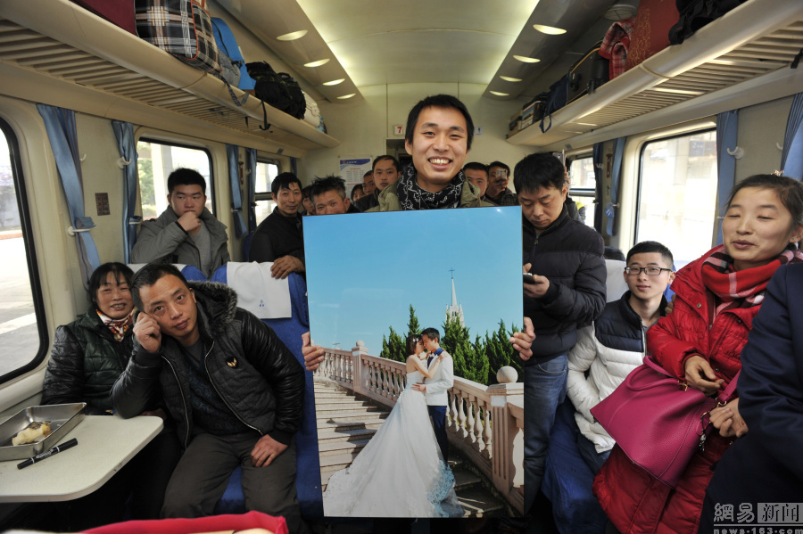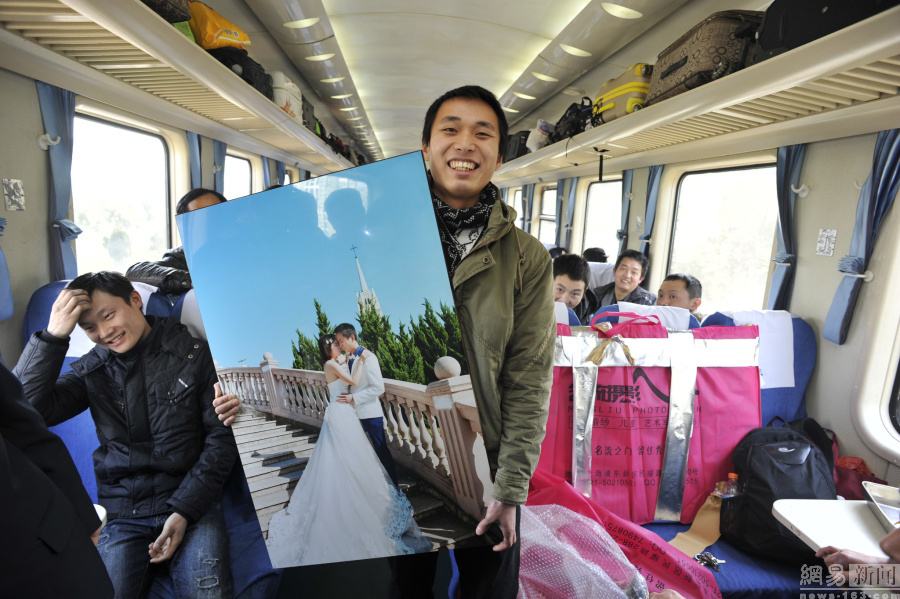 关键词:春运列车趣事 小伙 扛婚纱照回家