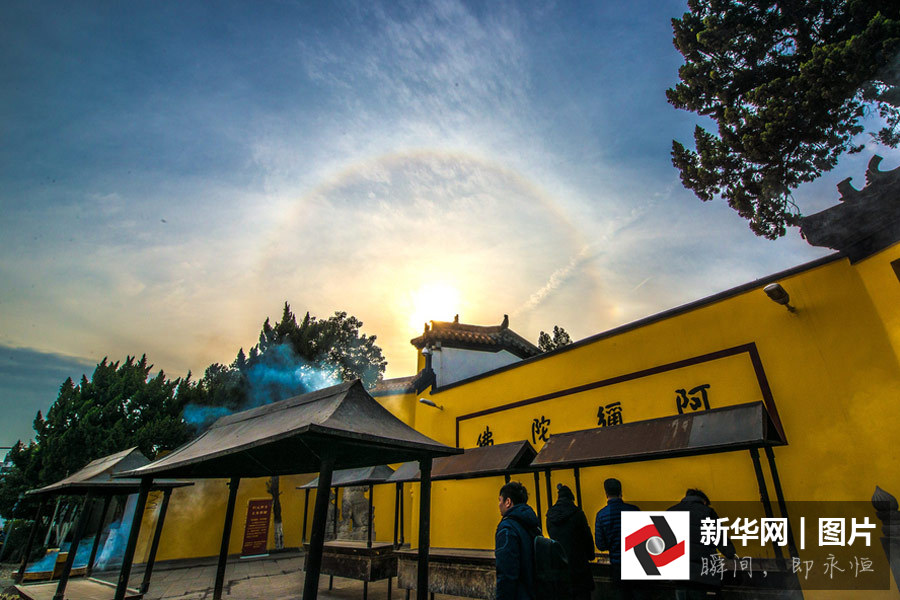 2016年1月26日,武汉归元寺天空中上演日晕奇观,日晕光环与寺院大佛、建筑相得益彰,简直美爆了朋友圈。图片来源:视觉中国