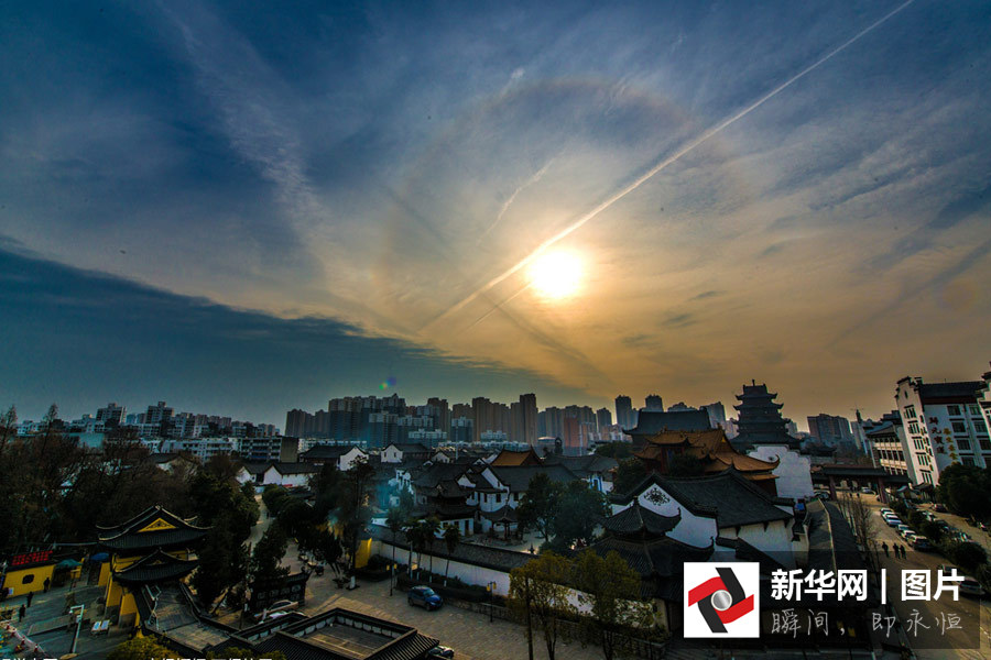 2016年1月26日,武汉归元寺天空中上演日晕奇观,日晕光环与寺院大佛、建筑相得益彰,简直美爆了朋友圈。图片来源:视觉中国