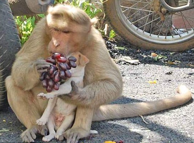 关键词:猴子收养流浪小狗 印度猴子 收养流浪小狗