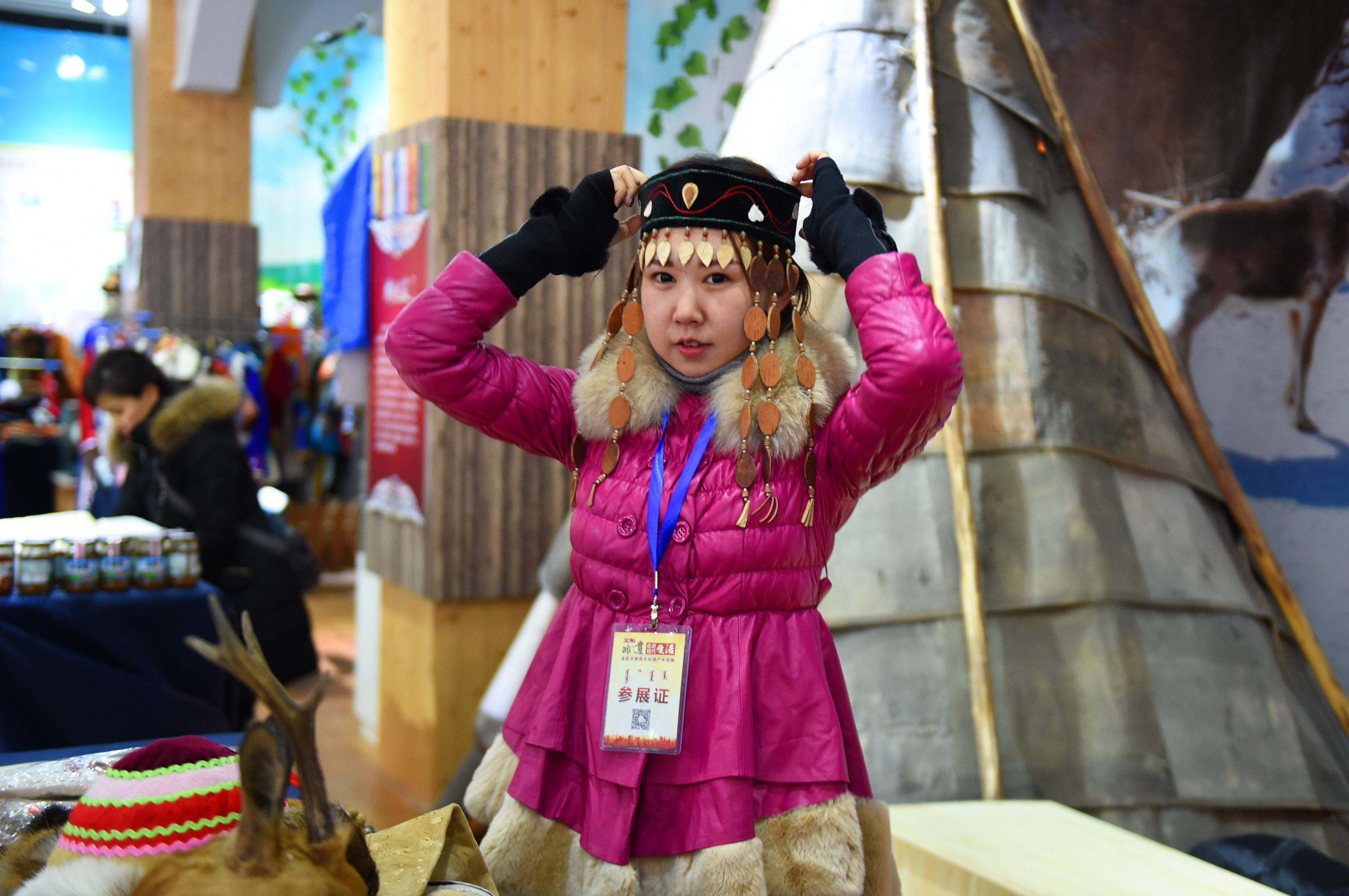 近日,内蒙古非物质文化遗产年货展在内蒙古展览馆举行,本次活动突出非遗“年文化”,主要展示非遗生产性项目和创意产品,包括与传统年俗有关的服饰、食品、纸艺、手工四大类150多个项目。图为内蒙古呼伦贝尔展商展示鄂伦春族传统头饰。