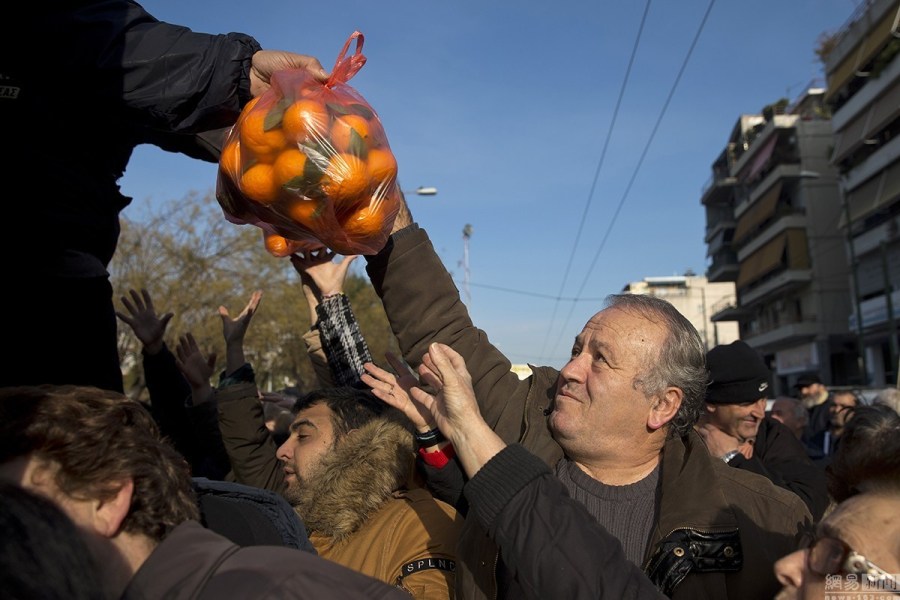 当地时间2016年1月27日,希腊雅典,农民与小贩抗议养老金改革,向民众免费发放水果和蔬菜,遭围观者疯抢。因国际债权人要求,希腊左翼政府提出养老金改革计划,遭到民众越来越强烈的抗议。东方IC