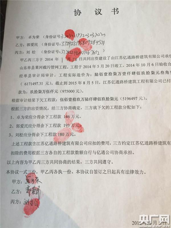 也就是说,工程完工时,工程队一分钱还没拿到,而竣工1年半年之后,工程款仍拖欠严重。郭爱民、闫华早已垫资把农民工工钱结清,自己背了数百万的外债。单县住建局长苏成玉也证实拖欠工程款的情况。他表示,现在还没有给清。