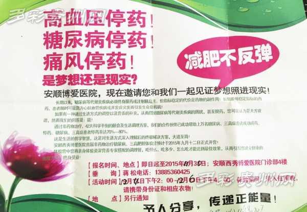 “高血压停药!糖尿病停药!痛风停药!是梦想还是现实? ” 该医院的广告宣传单上写道: “安顺博爱医院,现在邀请您和我们一起见证梦想照进现实! ”