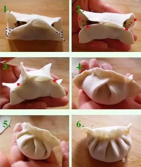 3、 褶子饺子。依照图中标出的红点捏上,变成图3四个耳朵。然后都往中间捏,就是图5的4个耳朵的饺子啦,图6是6个耳朵的。