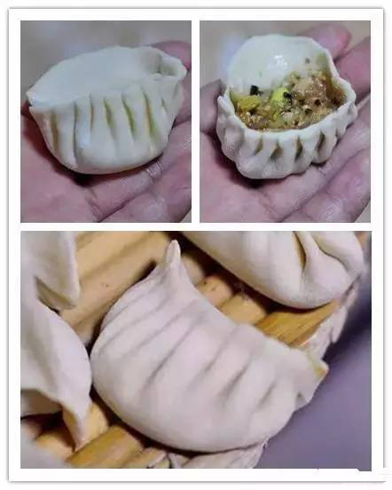 4、 百褶裙饺子??梢运嫡馐邱拮咏鹊纳栋姘?,在包进馅料之前,将2/3个饺子皮整出一堆褶皱,然后塞入馅料,对折捏好就成了。