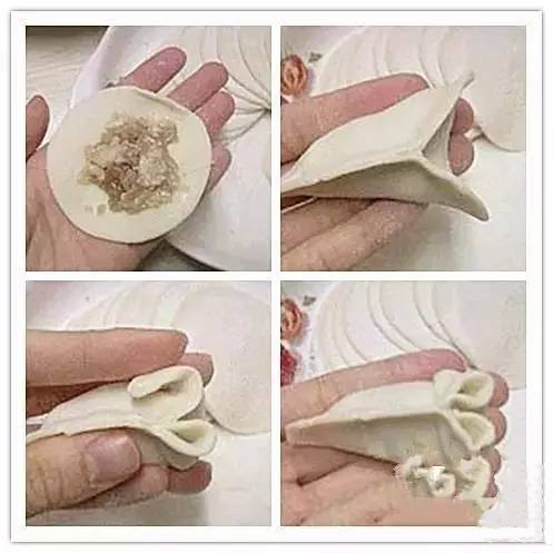 5、 三角花朵饺子。饺子皮按照等腰三角形的形状,找到三个点,捏合,形成三角形;随后,将较短的两条边分别向内卷,捏合成花瓣圆圈状即可。