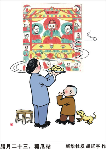 旧时,我国北方家家户户的厨房灶头常设有灶王神龛供人供奉。传说灶王爷在腊月廿三这一天会上天庭,向玉皇大帝汇报一家人一年来所做的好事与坏事。人们为了祈福求顺,常?;嵩谠钔跸窳奖咛小吧咸煅院檬拢陆绫F桨病被颉吧咸煅院檬?,回宫降吉祥”之类的对联,横批是“一家之主”,民间也由此诞生在腊月廿三当晚祭灶的习俗。