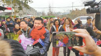 车还没开进水电新村,路就被邻居和媒体记者堵住了。陈满只好下来,缓步朝家走。其间,有人给他献上鲜花,有人给他戴上红绸。簇拥着,继续朝家走。