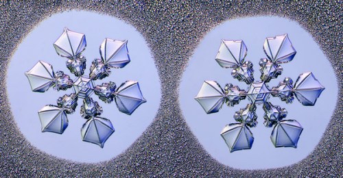 这些在同样环境中并排放置生长出来的双胞胎雪花几乎一模一样。