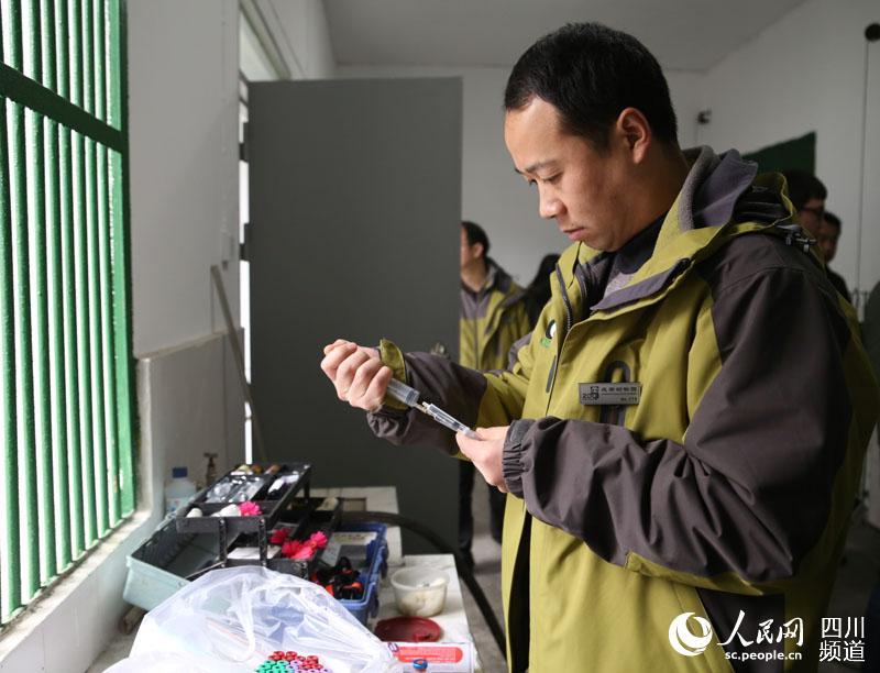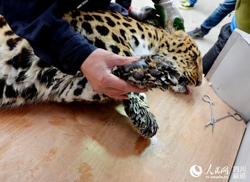 据了解,成都动物园老豹房的设备设施太过陈旧,为改善动物生活环境,进行环境丰容,动物园工作人员对豹房进行了重装。工作人员称,此次共有19只豹子搬进新家,目前,搬进新家的豹子们身体状况良好。图为正在接受身体检查的豹子摆出了吐舌瞪眼的表情,乐坏了在场的记者。 周栩如 摄 图片来源:人民网