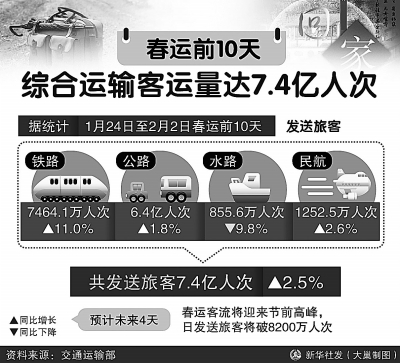 春运前10天全国综合运输客运量达7.4亿人次