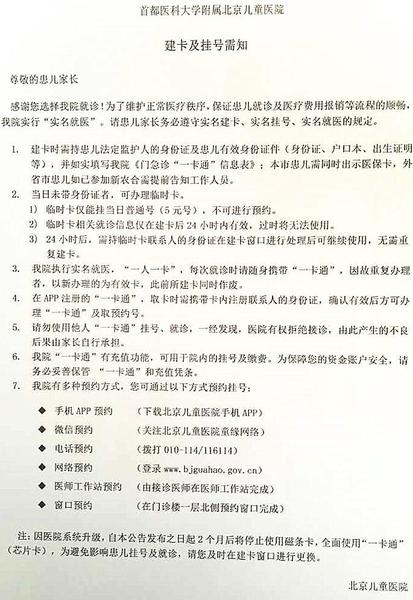 为维护正常的医疗秩序,保证患儿就诊及医疗费用报销等流程的顺畅,北京儿童医院即日起开始推行严格的“实名建卡、实名挂号、实名就医”制度。