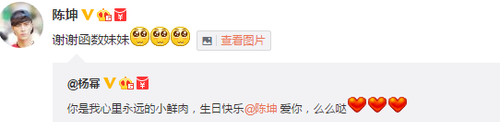 2月4日是陈坤40岁生日,0点15分,杨幂发微博祝陈坤生日快乐:“你是我心里永远的小鲜肉,生日快乐陈坤。爱你,么么哒。”随后,陈坤转发微博,“谢谢函数妹妹”,并附上一张魔性自拍照。