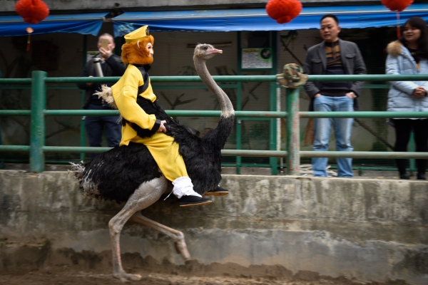 2月4日,在福州国家森林公园鸟语林,装扮成“孙大圣”的工作人员在排练节目。这个以“孙大圣与鸵鸟”为主题的游园节目将在猴年春节期间正式与游客见面。