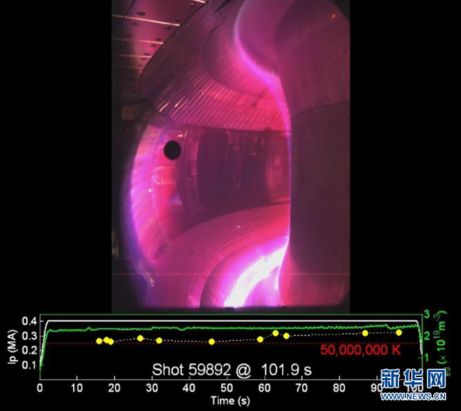 这是EAST5000万度、102秒等离子体放电实验数据图。记者4日从中科院合肥物质科学研究院了解到,该院等离子体所承担的大科学工程“人造太阳”实验装置(EAST)在1月底的实验中,成功实现了电子温度超过5000万度、持续时间达102秒的超高温长脉冲等离子体放电。这是国际托卡马克实验装置在电子温度达到5000万度时,持续时间最长的等离子体放电。专家们介绍,这一重大成果展示了EAST作为超导装置在较高参数下开展稳态实验研究的特长和能力,标志着中国在稳态磁约束聚变研究方面继续走在国际前列。新华社发